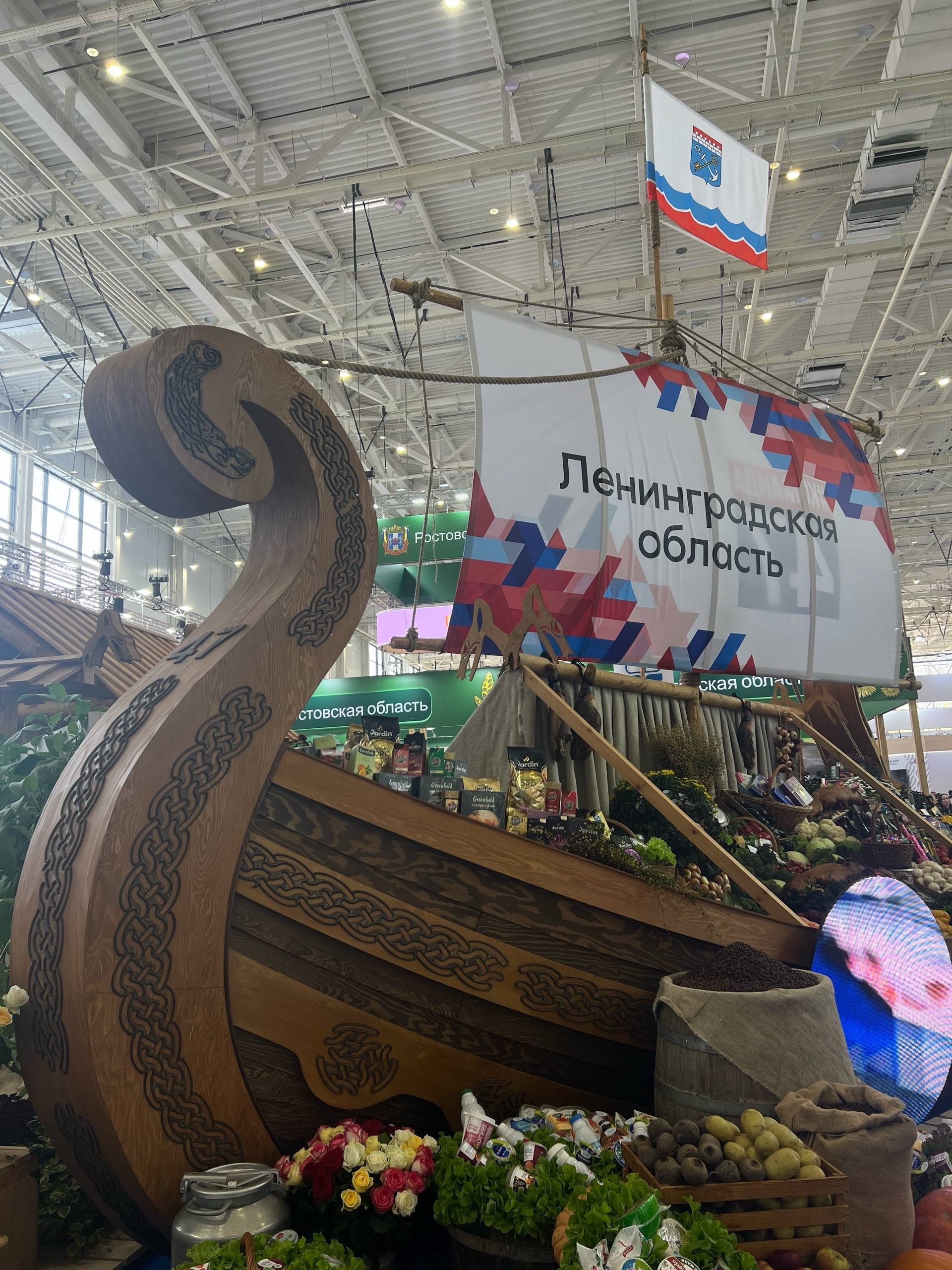 Экспозиция Ленинградской области впечатляет гостей своим разнообразием. Восемь тонн яблок и капусты, сыров и колбас, мяса и рыбы, кофе и хамона ленинградского, икры черной, красной и баклажанной отечественной — историческая ладья с торгового пути «Из варяг в греки» привезла в столицу дары земли житницы с Северо-Западного округа.