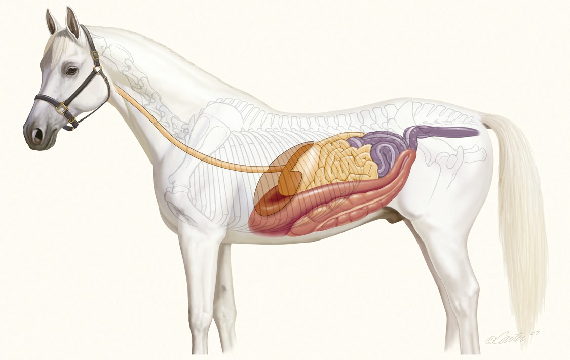 Предрасположенность лошадей к коликам обусловлена особенностями строения ЖКТ. Небольшой объём желудка (8–15 л) и его свободное подвешенное положение затрудняют естественное освобождение от корма. Пищевод впадает в желудок под острым углом с сильным мышечным кольцом, что полностью исключает возможность рвоты. Длинная брыжейка, изгибы двенадцатиперстной кишки и особенности подвздошной кишки повышают риск закупорки и инвагинации. Большие размеры слепой и ободочной кишок создают условия для заворота и метеоризма.