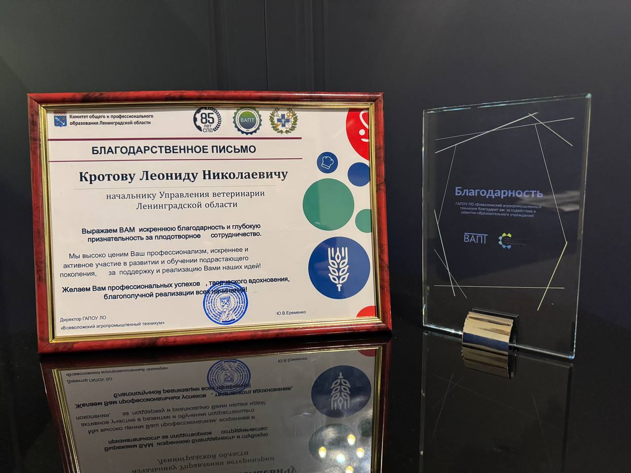 В рамках прошедшего семинара «Актуальные вопросы эпизоотологии, диагностики и лечения болезней животных» директор техникума Юлия Еременко вручила благодарность начальнику Управления ветеринарии Леониду Кротову за многолетнее и плодотворное сотрудничество.