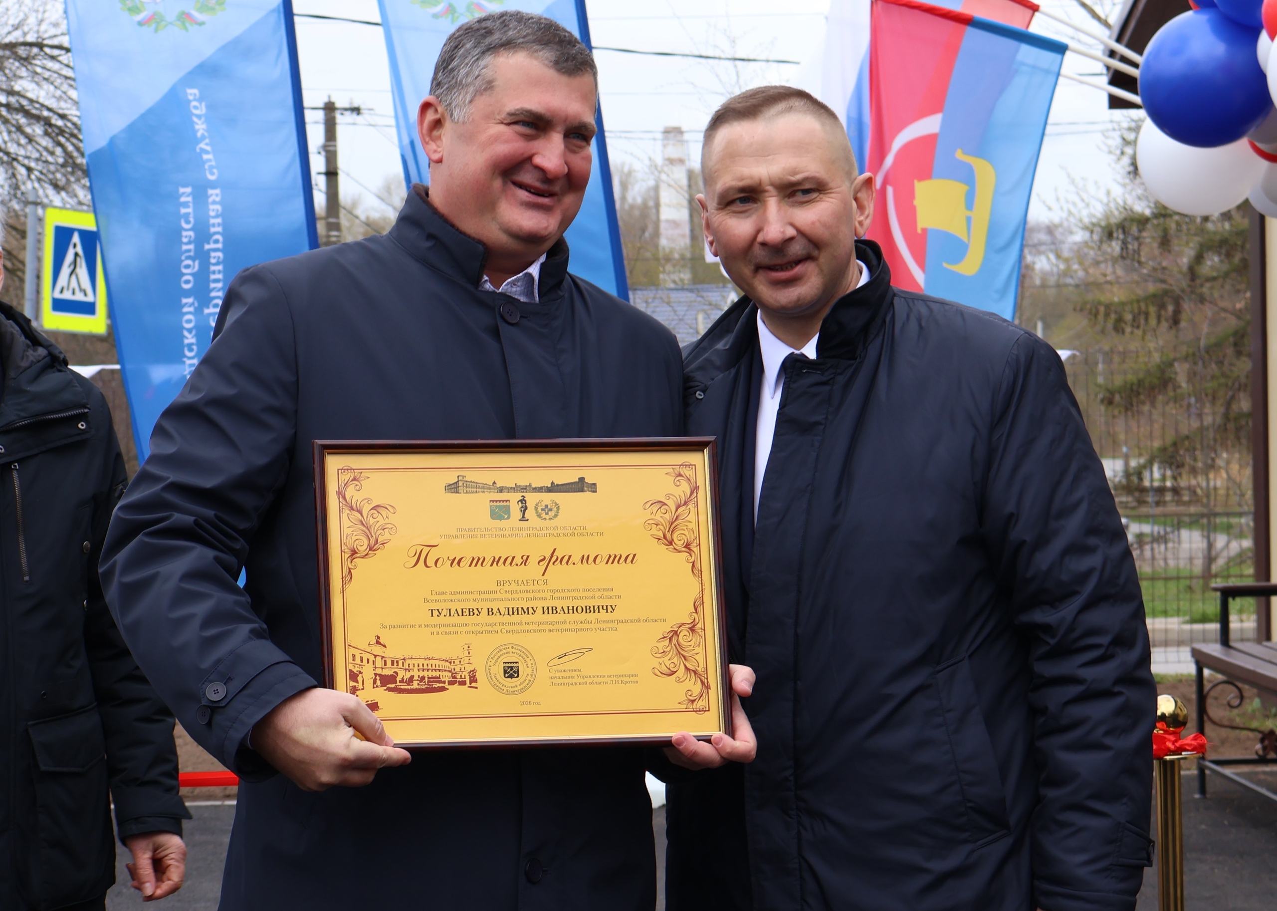 За развитие и модернизацию государственной ветеринарной службы Ленинградской области и в связи с открытием Свердловского ветеринарного участка Почетная грамота Управления ветеринарии Ленинградской области вручена главе администрации Свердловского городского поселения Вадиму Тулаеву.